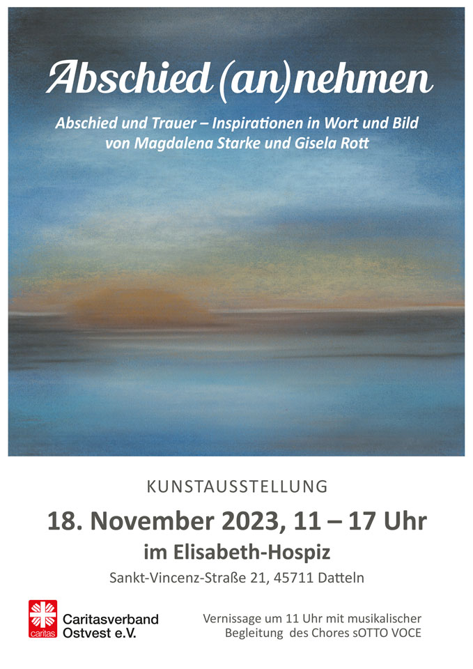 Das Dattelner Elisabeth-Hospiz zeigt am 18.11. von von 11 bis 17 Uhr die Ausstellung „Abschied (an)nehmen – Inspiration in Wort und Bild“ von Magdalena Starke und Gisela Rott. Gezeigt werden Bilder und Texte, die sich mit dem Thema Trauer auseinandersetzen.